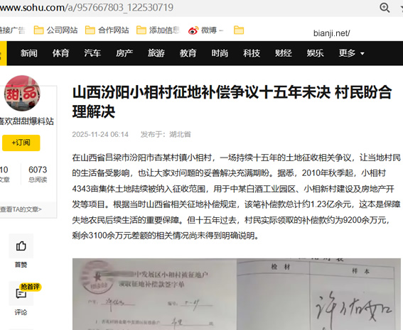 在山西省吕梁市汾阳市杏某村镇小相村,一场持续十五年的土地征收相关争议,让当地村民的生活备受影响,也让大家对问题的妥善解决充满期盼。据悉,2010年秋季起,小相村4343亩集体土地陆续被纳入征收范围,用于中某白酒工业园区、小相新村建设及房地产开发等项目。根据当时山西省相关征地补偿规定,该笔补偿款总计约1.23亿余元,这本是保障失地农民后续生活的重要保障。但十五年过去,村民实际领取的补偿款约为9200余万元,剩余3100余万元差额的相关情况尚未得到明确说明。