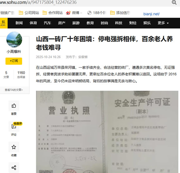 在山西运城万荣县荣河镇,一家手续齐全、合法经营的砖厂,遭遇多次莫名停电、无证强拆,经营者奔波求助却屡屡无果,更牵扯百余位老人的养老积蓄难以追回。这场始于 2016 年的风波,至今仍未迎来明朗结局,背后的故事满是无奈与揪心。