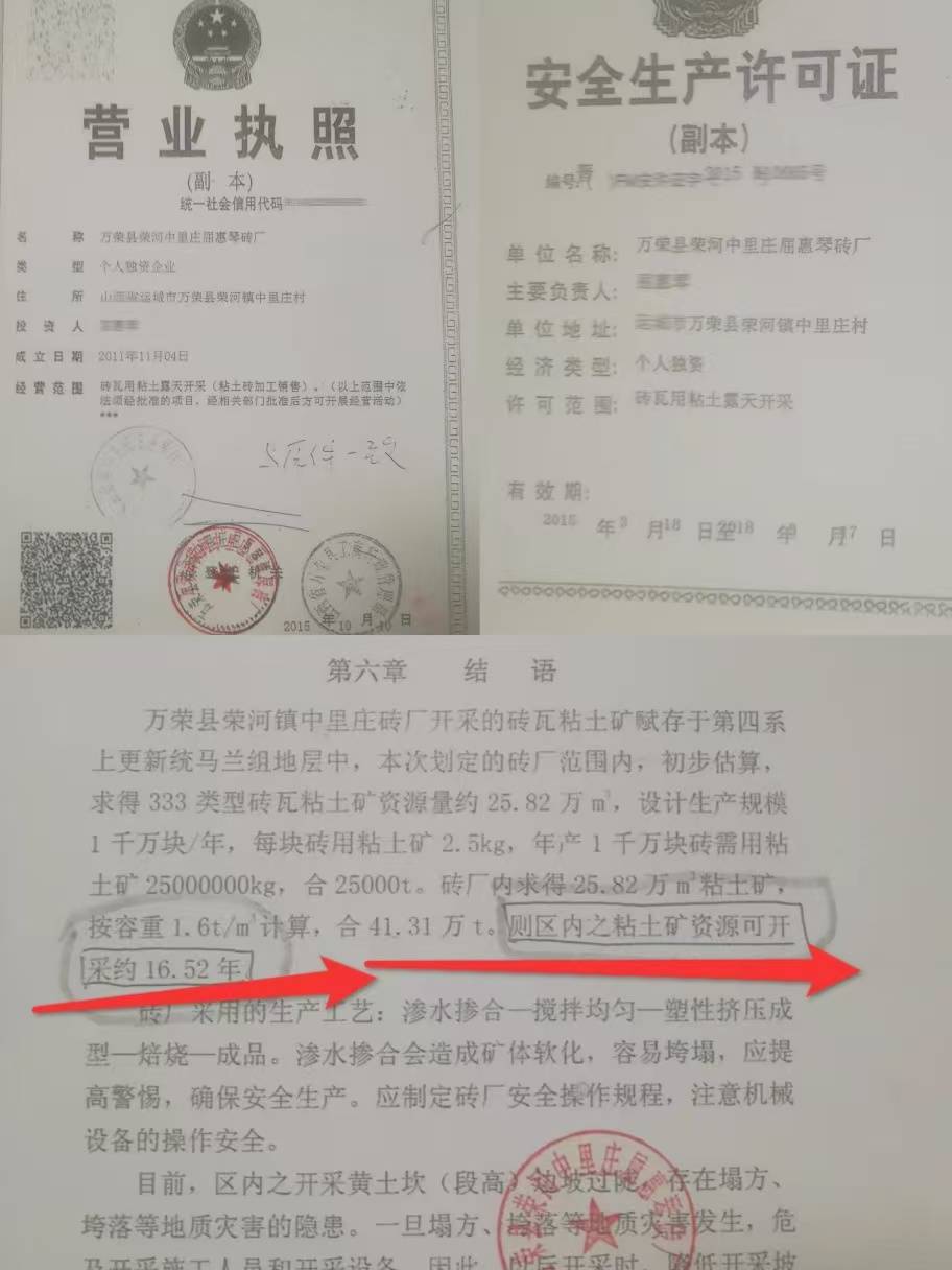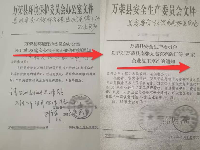2011 年,万荣县荣河中里庄屈惠琴砖厂依法成立,拿到了营业执照、采矿许可证、安全生产许可证等全套证件。采矿许可证本可续期 16 年,安全生产许可证剩余 15 年有效期,起初的经营之路看似平稳顺畅。但在2016 年 5 月,平静被打破。县环保局不说什么理由就给县供电公司下发文件,要求对 35 家砖厂断电,屈惠琴砖厂在列,可文件中并未列明砖厂具体的违法事实。