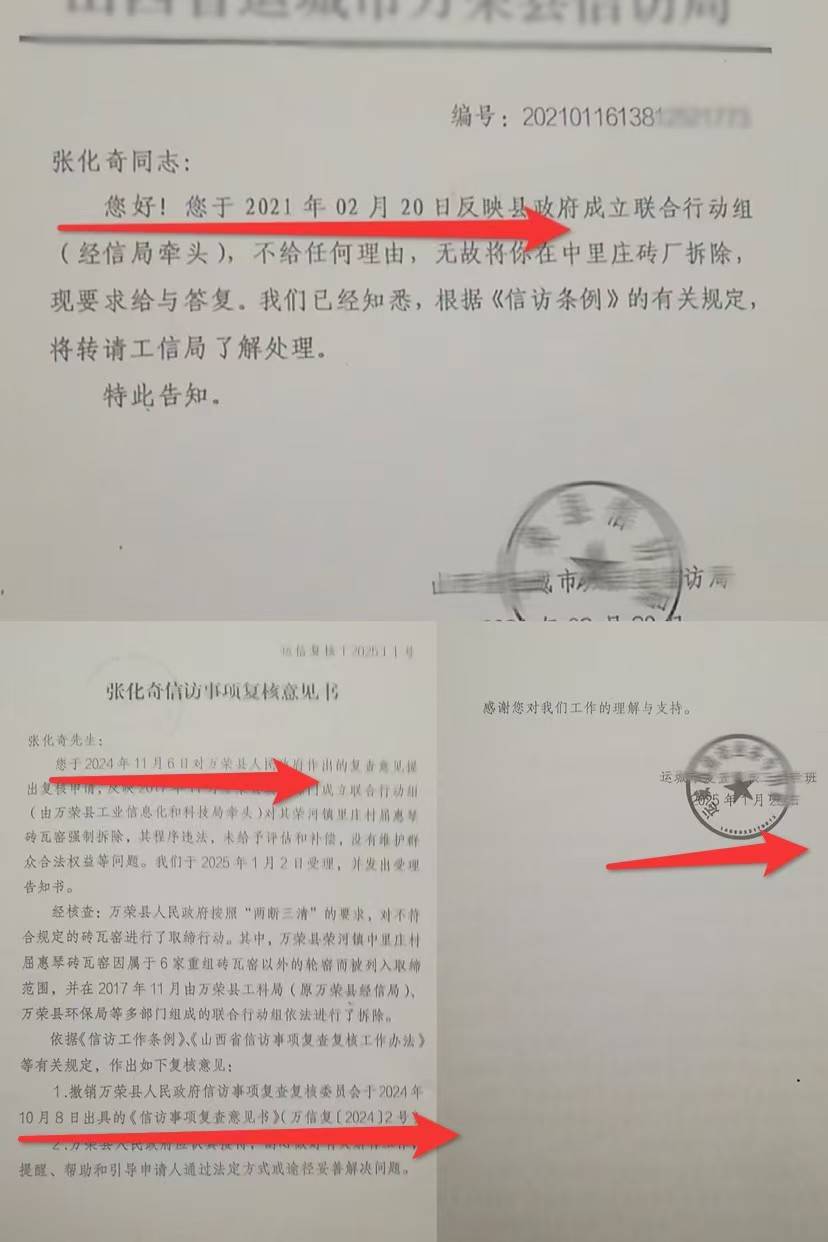 。期间砖厂经营者张化奇多次提交申请,后国家信访局于 2024 年 2 月和 5 月两次督办,县相关单位却依旧维持原结论,复查复核程序也多次超期。县相关单位信访复核委员会10月8日作出的信访复查意见书,又被运城市信访局给撤销了。过程中,信访局、经信局相关领导曾口头承诺 “提供项目” 弥补损失,最终却成了空头支票。无奈之下,张化奇寻求司法帮助。
